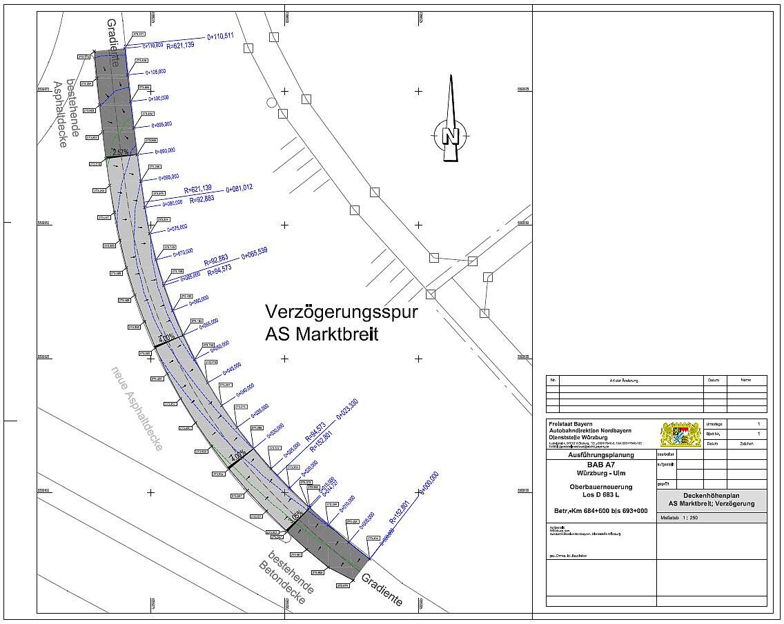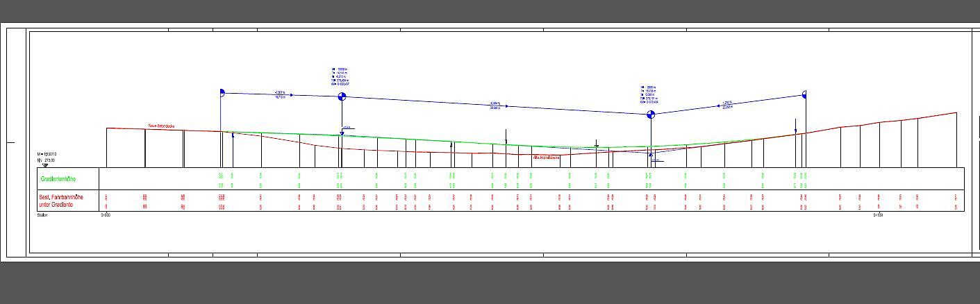 Planung der Oberbauerneuerung. Querneigungswechsel, Achsen, Deckenbuch, Gradiente, Querschnitte.