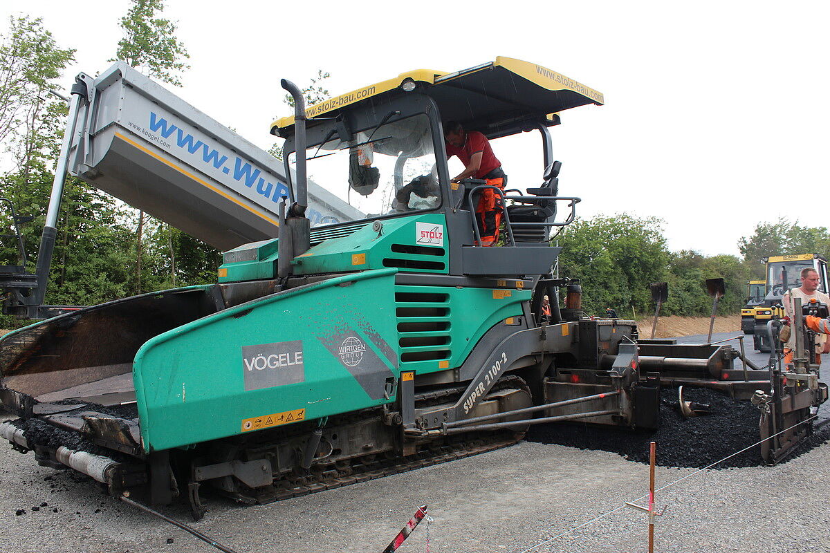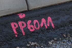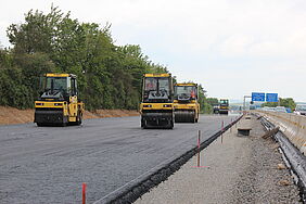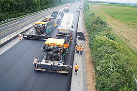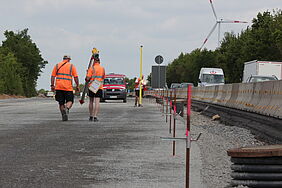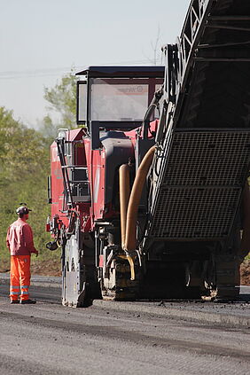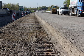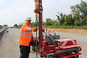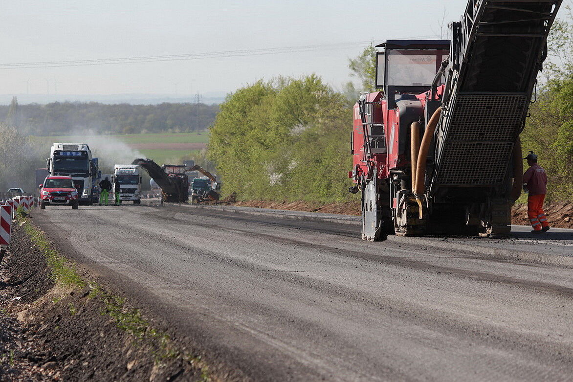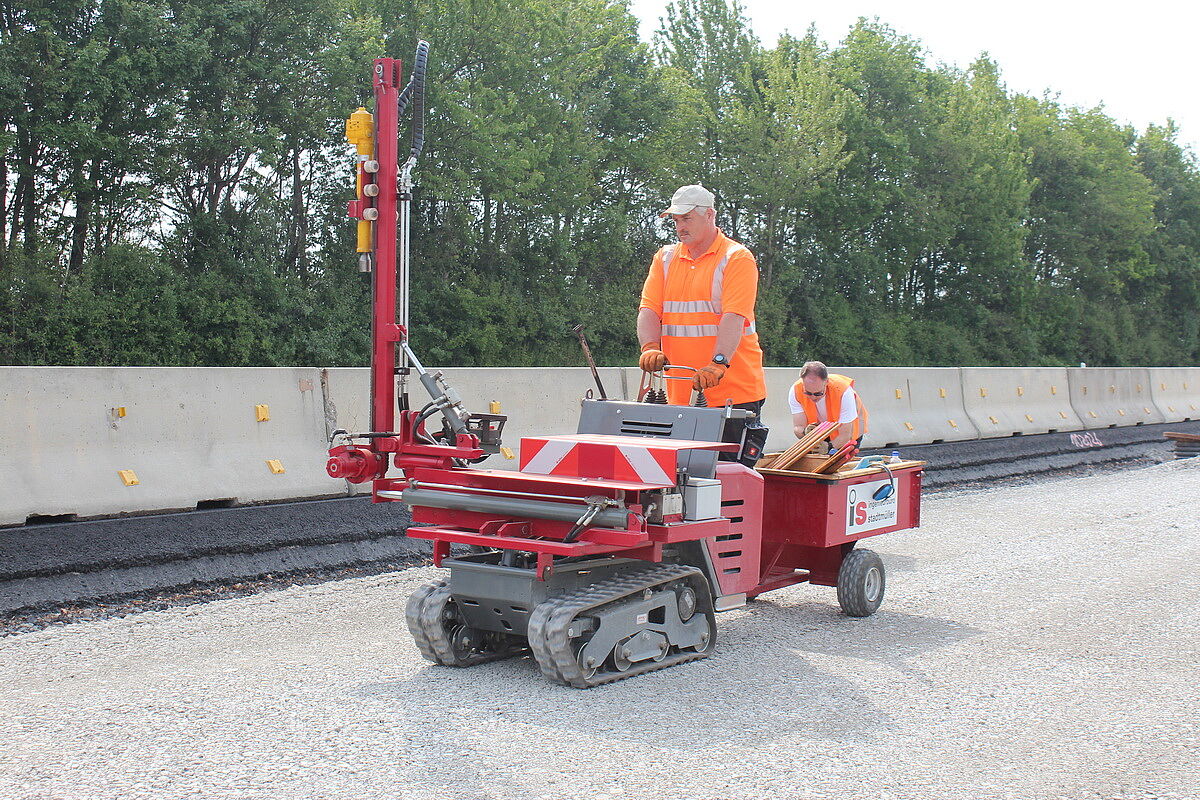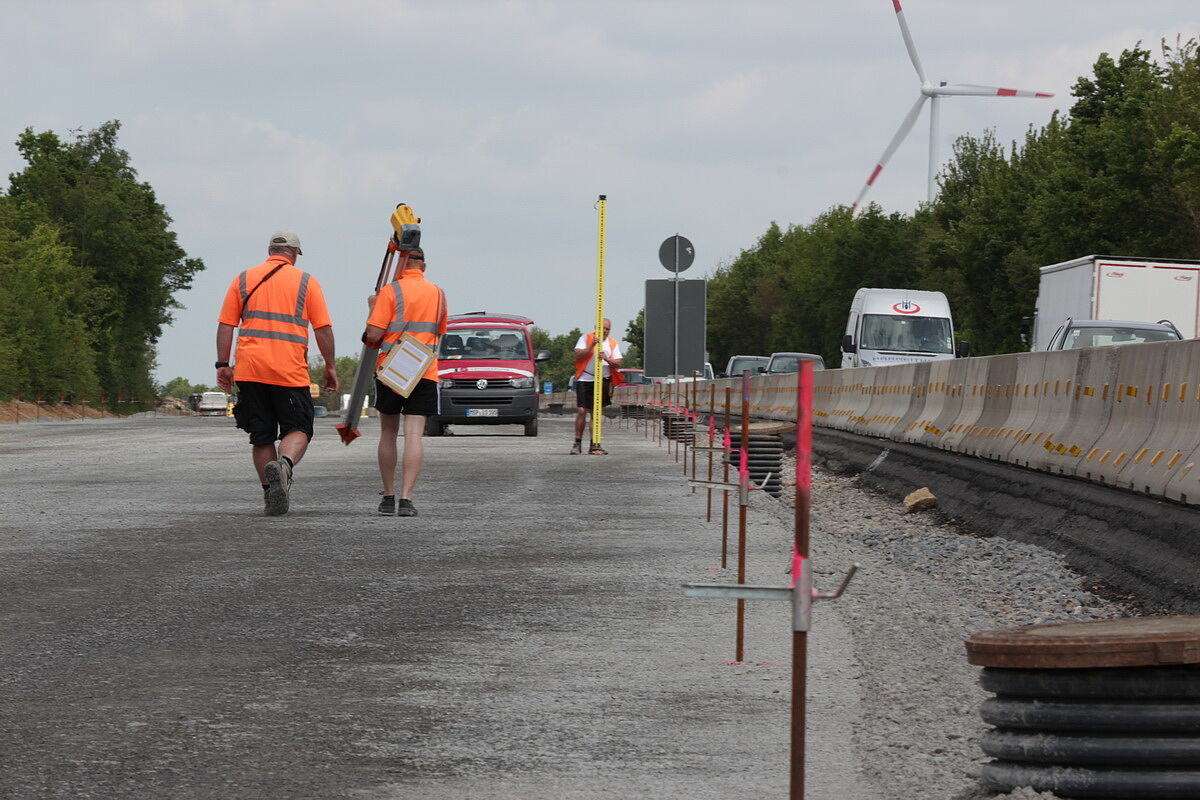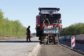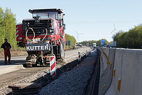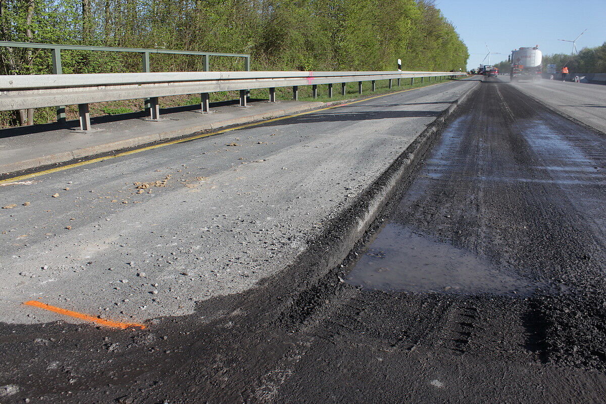 Erstes Fräsen der alten Fahrbahn auf der Autobahn A7 bei KM 471. Aufmaß der Fräsflächen zur exakten Dickenermittlung und Abrechnung.