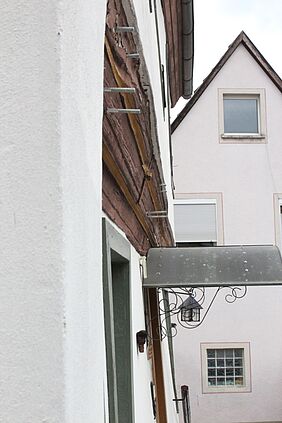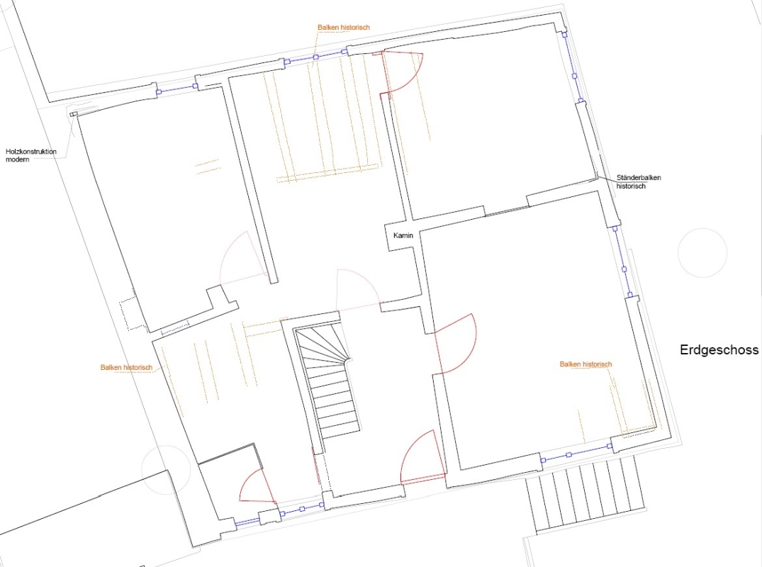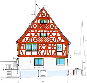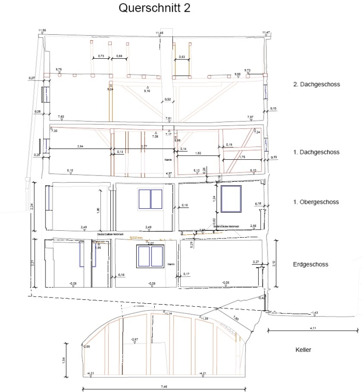 Aufmass eines historischen Gebäudes mit dem Laserscanner. Erstellung von Ansichten, Schnitten und Grundrissen unter besonderer Berücksichtigung und Erfassung historischer Bausubstanz. Die Vermessung erstreckt sich über alle Geschoße, den Keller und dem Außengelände.