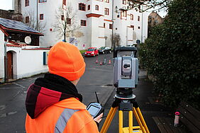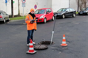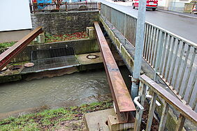 Für die genaue Planung einer neuen Pleichachbrücke, ist es nötig die exakte Haltung, also Richtung und Lage sowie Sohltiefe und Fließrichtung, des Kanals zu bestimmen. Zur Anwendung kam ein spezieller 3 Meter langer Kanallotstab. Der Kanal quert die Pleichach in der Nähe der Brücke Hofstrasse.