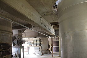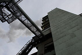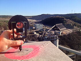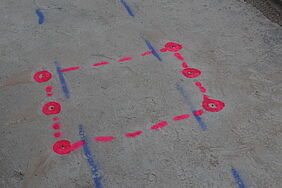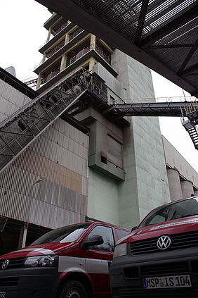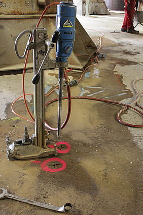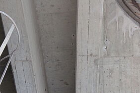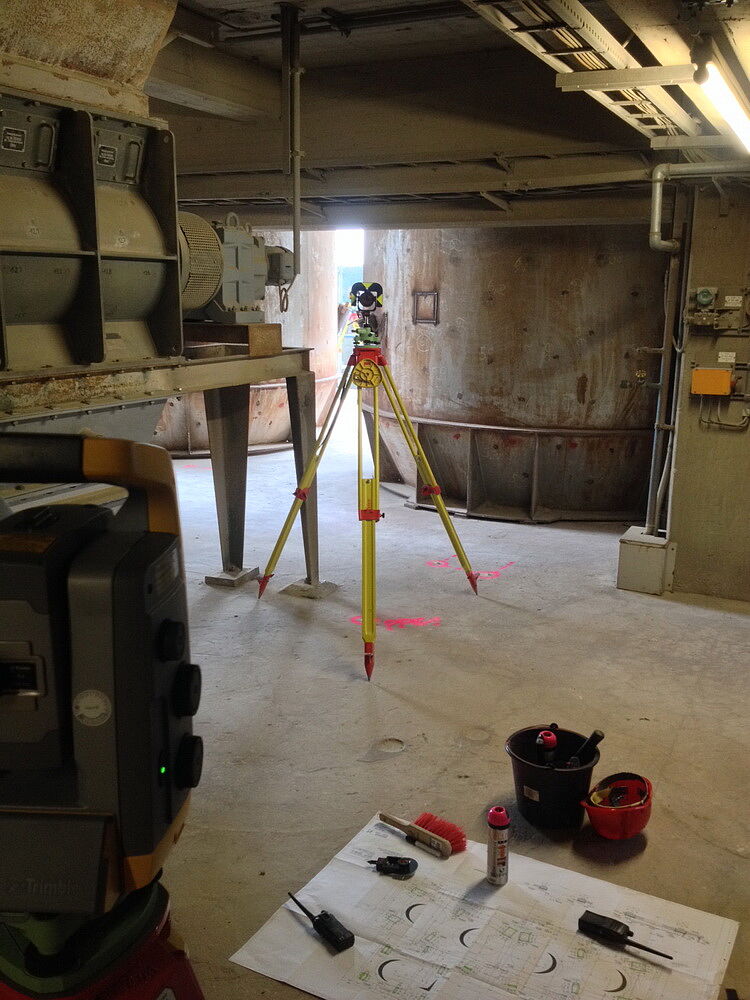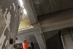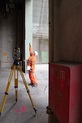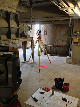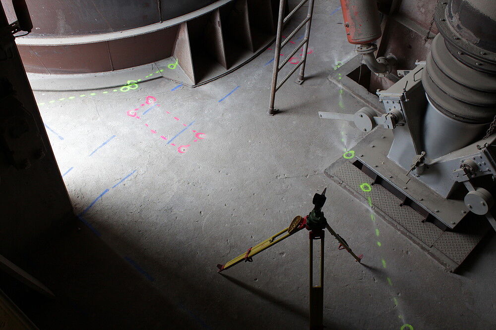 Bestandsvermessung der Unterzüge und Stützen des 70 Meter hohen Turmes. Abstecken der Bohrlöcher für die Verankerung der neuen Fertigungstechnik auf den verschiedenen Etagen.