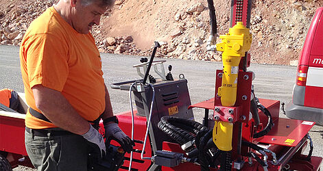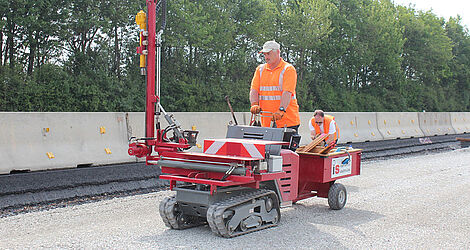 Mit großem Engagement entwickeln wir individuelle Lösungen für spezifische Einsatzzwecke. Unser kettengetriebenes Spezialfahrzeug zur schnellen und präzisen Absteckung von Trassenverläufen – fixiert Messstäbe mittels Hydraulik – stammt aus eigener Entwicklung.